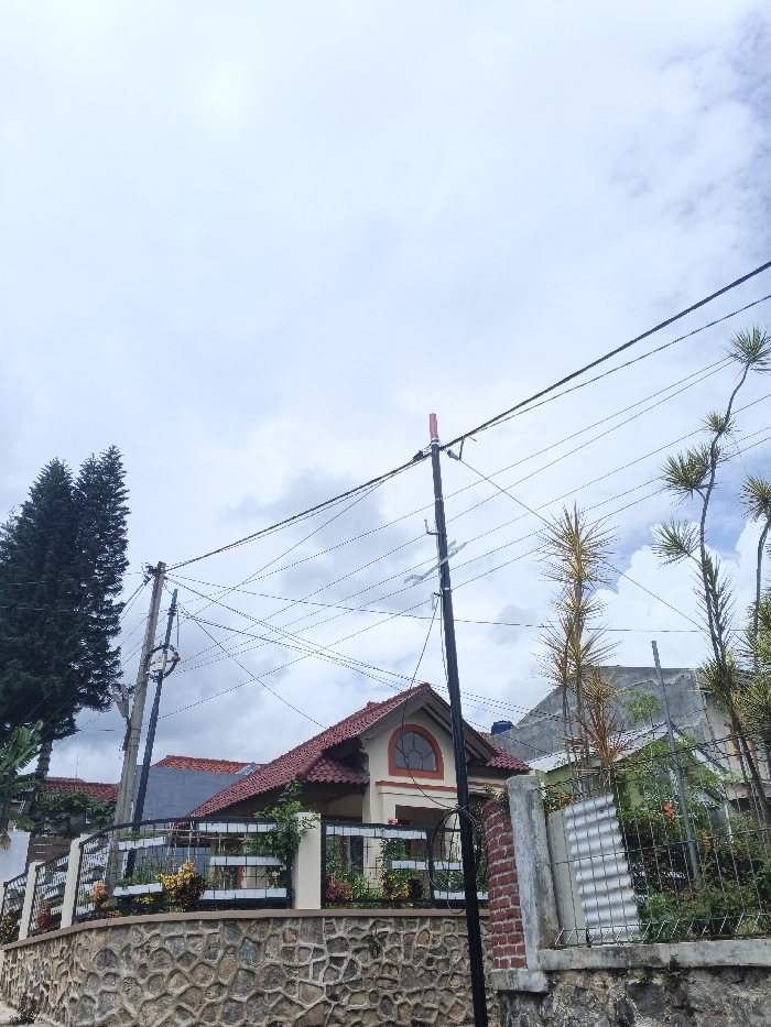 A view of houses under a cloudy sky is shown. An eye-level shot depicts a light-colored house with a red roof, enclosed by a dark iron fence and a stone wall. Another house is visible behind, along with greenery. Overhead electrical wires intersect the scene, anchored to black utility poles. Tall, slender plants grow beside the fence. A dark green conifer tree stands on the left side of the frame.