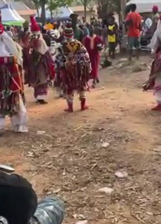 The video captures a vibrant scene of traditional masquerade performers in what appears to be an outdoor cultural event