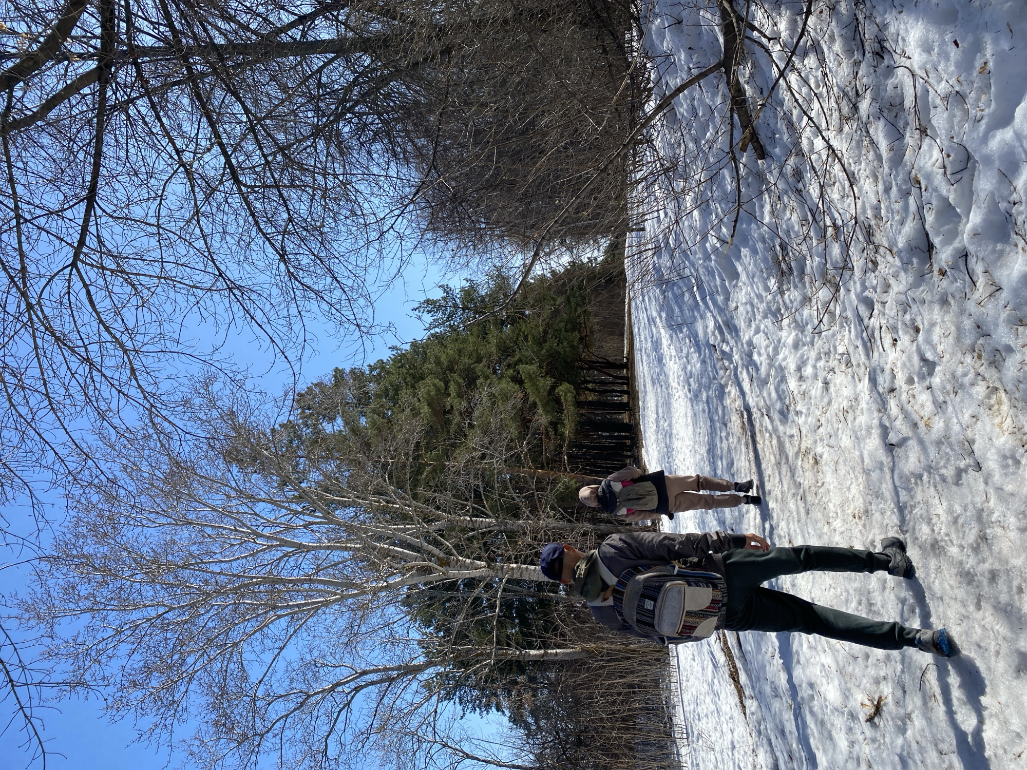 Two individuals are walking along a snowy path in a wooded area in Ulyanovsk, Russia. The path is covered in snow, and there are trees on either side. The sky is blue and clear. The first individual is wearing a dark jacket, dark pants, and a backpack. The second individual is wearing a beige jacket and beige pants with a backpack. The photo is rotated 90 degrees to the left.