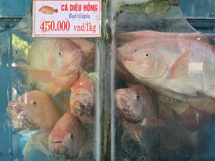 Two glass tanks hold live red tilapia