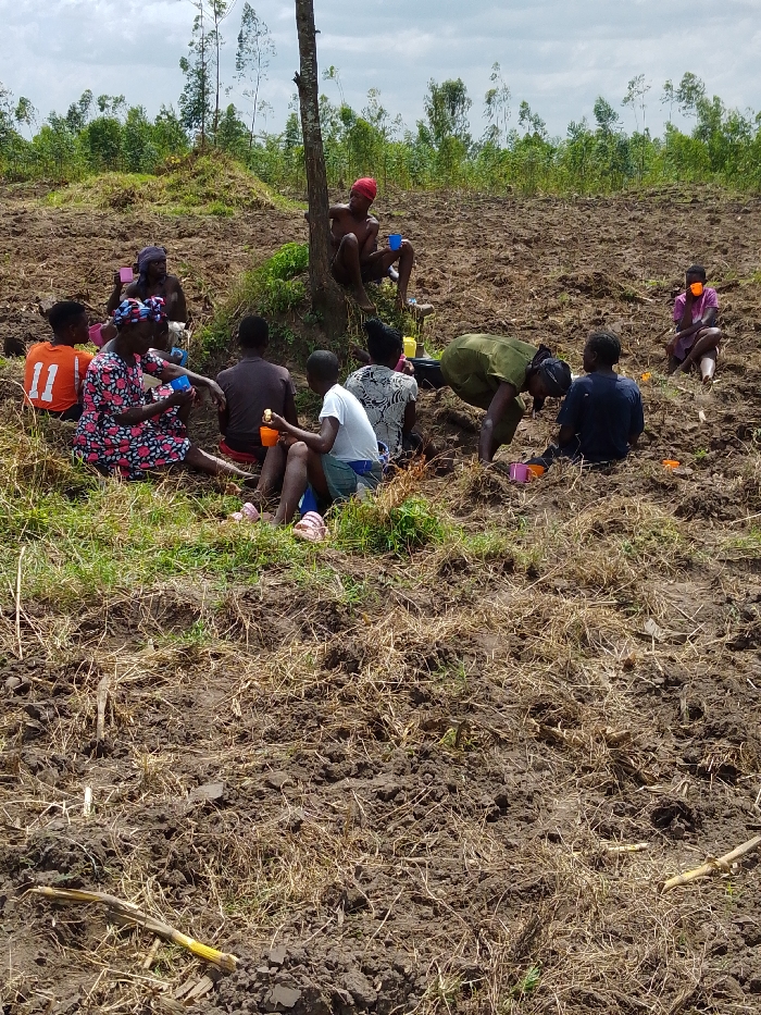 In a cultivated field, a group of people rests. One man sits on a tree, drinking from a blue cup. Others are seated on the ground, also drinking from cups of various colors. Some individuals wear brightly colored clothing, while others wear more subdued tones. The field appears recently tilled, with patches of grass and dry straw scattered across the surface. Tall trees are visible in the background, suggesting a rural or agricultural setting.