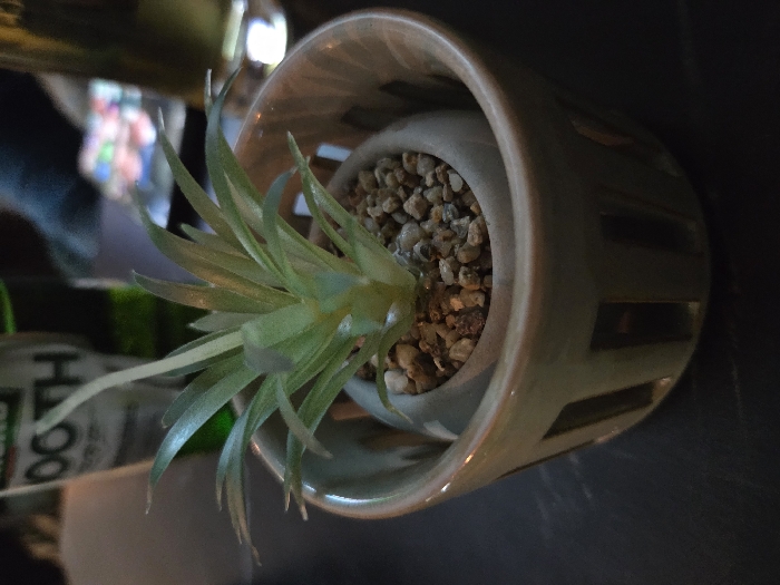 This image depicts a small potted plant situated on a dark surface in an indoor setting within Negorci, North Macedonia. The plant, resembling a young pineapple or bromeliad, features multiple stiff, light green leaves emanating from a central stalk. It is contained within a small, light grey, concrete-like pot filled with light-colored gravel or pebbles. This inner pot is placed inside a larger, decorative, light greenish-brown ceramic pot that has vertical rectangular cut-outs around its circumference. In the blurred background, a dark green bottle with a partial white label displaying "OOTH" and "H" is visible to the left. To the right, a glass containing a light-colored liquid, possibly beer, and a blurry reflection of colorful lights or objects are present. A dark, indistinct form, possibly a person, is faintly discernible in the far background. No people are directly visible or engaged in actions. The scene is static and dimly lit.