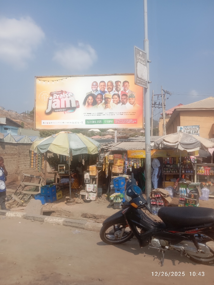 The image captures a commercial street scene in Lokoja, Nigeria, on 12/26/2025 at 10:43 AM, under a clear blue sky with sparse clouds. A large horizontal billboard, prominently positioned in the upper-middle frame, advertises "Christmas Praise Jam - REHEATED" for "25TH DEC, 2025 12:00PM" at "KAYTTEE EVENTS HALL," featuring photographic portraits of twelve individuals (seven men, five women). Directly beneath the billboard, a row of roadside stalls with striped awnings and corrugated metal roofs display various goods, including stacks of blue beverage crates, bottled water, and packaged products. A black motorcycle, an underbone model with silver wheels, is parked on its kickstand in the right foreground on the unpaved road. The road features a concrete curb bordering an open drainage ditch. A tall, grey utility pole stands centrally, supporting the billboard and a smaller vertical sign reading "Fabulous Lifestyle." On the far left, a person in a patterned blue and white shirt is partially visible. Another individual is partially obscured by merchandise within one of the right-side stalls. Distant hills with residential structures are visible in the background to the left, while a building displaying a sign partially reading "ALIMAN MAURE" is present on the far right.