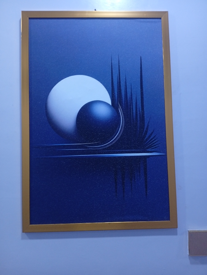 An abstract artwork, framed in a gold-colored rectangular border, hangs vertically on a light blue wall in Lokoja, Nigeria. The artwork features a dark blue, textured background. On the left, a large, light grey or off-white sphere is partially overlapped by a smaller, dark blue, reflective sphere. A thin, curved, metallic-looking strip encircles the dark blue sphere. To the right of the spheres, a cluster of tall, dark, spiky, abstract forms rises from a horizontal line, reflecting downwards onto the dark blue surface below. A light-colored rectangular fixture is partially visible on the wall below and to the right of the frame. No individuals or specific actions are depicted.