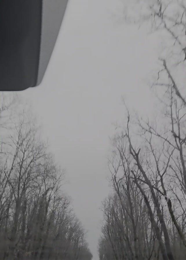view from inside a car driving on a road, likely during a day with overcast weather. The road stretches straight ahead, flanked by rows of trees with bare branches, suggesting it is winter or a similar season. The windshield has some moisture on it, and the wiper sweeps across, clearing the driver's view. The inside of the car, including the dashboard and a portion of the sun visor, are visible in the foreground, emphasizing the point-of-view nature of the recording. The scene is somewhat gloomy and desaturated due to the weather and time of year.