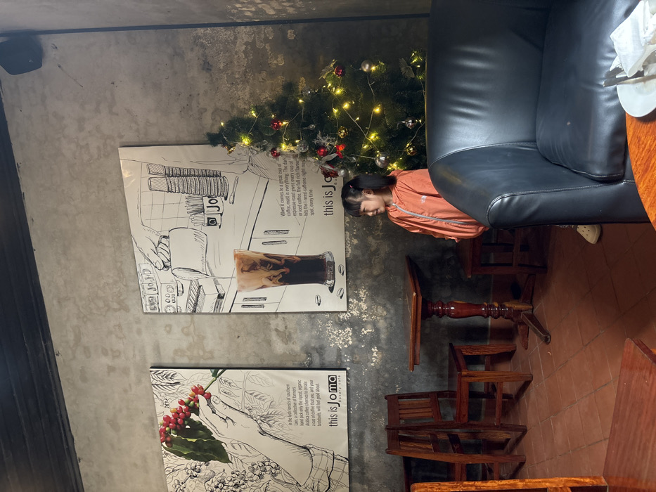 An indoor scene shows a black leather couch and a person wearing an orange jacket near a Christmas tree. The room features tiled floors and textured walls. Artwork, with an illustration of coffee and the brand name "Joma," is displayed on the wall. Wooden tables and chairs are arranged around the room. The image has been rotated counterclockwise.