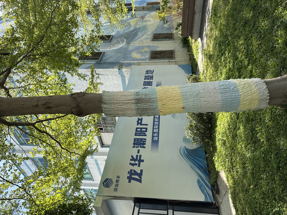 The image displays an outdoor urban environment, specifically identified as being in Longhua District, China, based on text visible on a prominent banner. The central foreground is dominated by the trunk of a deciduous tree, which is wrapped in a multi-colored, horizontally striped knitted or crocheted yarn covering. The yarn displays alternating bands of white, light blue, yellow, and grey. Green foliage from the tree and surrounding shrubs is visible, illuminated by strong, direct sunlight, creating dappled shadows on the ground. In the mid-ground, to the left of the tree, stands a large white banner with blue text and a blue wave graphic along its bottom edge. The text on the banner reads "深汕携手" (Shenshan Hand in Hand), accompanied by a handshake logo, and below it, "龙华-潮阳产业发展基地" (Longhua-Chaoyang Industrial Development Base), and "汕头国际纺织城" (Shantou International Textile City). A dark metal fence or gate is partially visible in front of the banner on the far left. To the right of the tree and behind the banner, a two-story building is visible. Its facade is constructed with light blue tiles and features a large painted mural depicting celestial objects, including a moon or planet and stars. Multiple rectangular windows with metal grates are present on the building's exterior. The ground consists of well-maintained green grass, and a paved pathway is visible on the far right, alongside a section of a wooden bench with metal supports. No individuals are present in the scene.