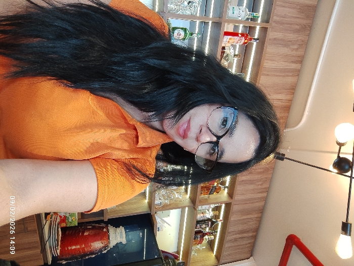 A woman with long dark hair and glasses poses for a selfie. She is wearing an orange top. Behind her is a bar with illuminated shelves displaying bottles. A modern light fixture hangs on the right side of the image. The bottom left corner shows what appears to be a glass beverage dispenser. The photo has a timestamp of "09/02/2026 14:09" at the bottom left.
