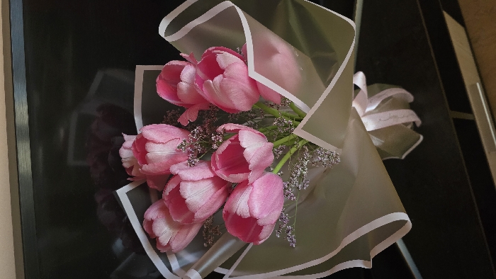 - "A bouquet containing approximately ten pink tulips is presented in a vertical orientation" by FM-tgCpu2, licensed under CC BY 4.0