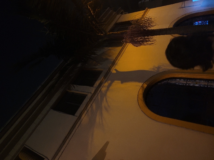 The image depicts an exterior street scene at night in Bogota, Colombia. A multi-story building with a light-colored facade occupies the left and central portions of the frame, illuminated by warm, artificial light. This illumination casts an orange-yellow hue on the building's surface. The building features two dark rectangular windows on an upper floor and two large, dark arched openings on the ground floor; the left archway reveals a wrought iron gate. A tall, slender palm tree stands to the right, its dark trunk rising vertically. Drooping, reddish-brown plant material is visible hanging from the tree's upper trunk. The palm tree casts a prominent, dark shadow, displaying its trunk and fronds, onto the building's facade. The top of the frame shows a dark night sky. In the lower center-right foreground, the back of a person's head with dark, medium-length hair is visible, oriented towards the building and palm tree.