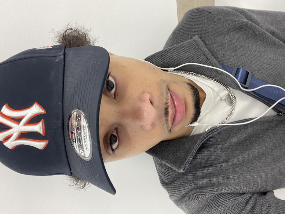 The scene depicts a close-up, waist-up portrait of an individual, stated to be located in the city of Plaisir, France. The subject is a male with medium skin tone, dark eyes looking directly at the viewer, a mustache, and a goatee. He is wearing a dark blue New York Yankees baseball cap with a white "NY" logo outlined in orange; a "9FORTY ADJUSTABLE" sticker is visible on the brim. Dark, curly hair is visible protruding from under the cap. He wears a dark grey, ribbed, full-zip sweater over a white t-shirt. Two silver-colored necklaces are visible: a thicker chain and a thinner chain with a round pendant. White wired earphones are inserted into his ears, with the wires hanging down his chest. A dark blue strap, possibly from a bag, is visible over his right shoulder. The background is a plain, light-colored wall, indicating an indoor setting.