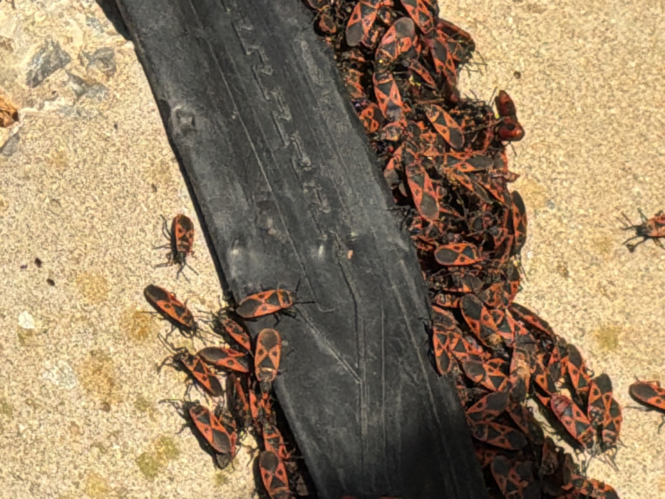 - "A dense cluster of boxelder bugs congregates along a black, weathered object, likely wood or rubber" by FM-vA9lX2, licensed under CC BY 4.0