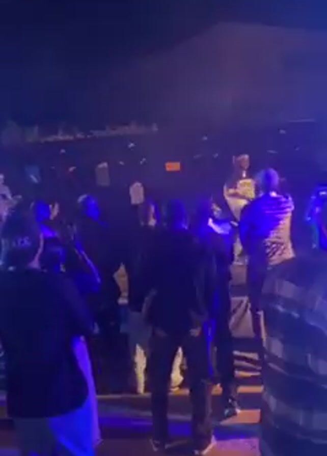 crowd of people in a darkened outdoor space, illuminated by colorful lights, likely at a concert or party. The camera is handheld and moves through the crowd. The attendees appear to be enjoying themselves, some raising their hands in the air. Most are dressed in casual attire. In the background, a stage or elevated platform is visible, with figures standing on it. The lighting is dynamic, with blue, purple, and red hues creating a vibrant atmosphere.