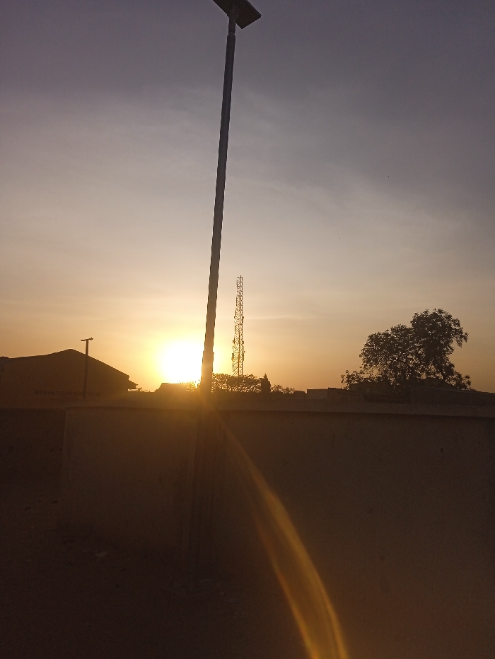 The image depicts a rural or semi-urban landscape in Garun Gawa, Nigeria, at either sunrise or sunset. The sun is low on the horizon, emitting a strong light that creates a lens flare extending diagonally across the lower right quadrant of the frame. In the immediate foreground, a dark, unpaved ground surface is visible, leading to a prominent light-colored, possibly concrete or plastered, wall that horizontally bisects the lower half of the image. A tall, slender pole, topped with a solar panel and light fixture, stands centrally in the foreground, silhouetted against the bright sky. Behind the wall, on the left, a dark silhouette of a building with a pitched roof is partially visible. Further back, slightly to the right of the center, a lattice communication tower stands tall, also silhouetted. Several trees, including one with dense foliage on the far right, are silhouetted against the warm, orange-to-purple gradient sky. No individuals or explicit actions are discernible.