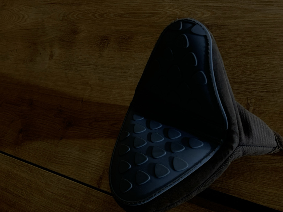 A dark brown oven mitt rests on a wood-grain surface. The mitt is triangular with a silicone grip, featuring raised semi-circles and triangles for better hold. The surface the mitt sits on appears to be wood paneling. The image is dimly lit, casting a shadow across the wood grain on the left side of the frame, making the mitt the main focus.