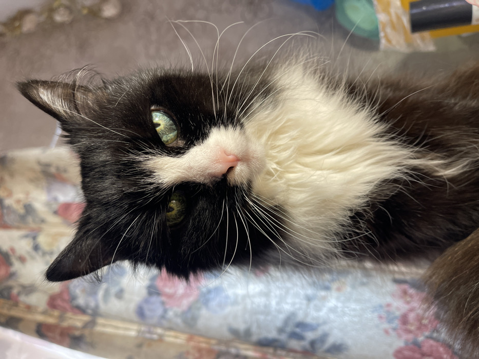 A medium-haired domestic cat with prominent black and white markings is depicted in a close-up, head-and-shoulders portrait