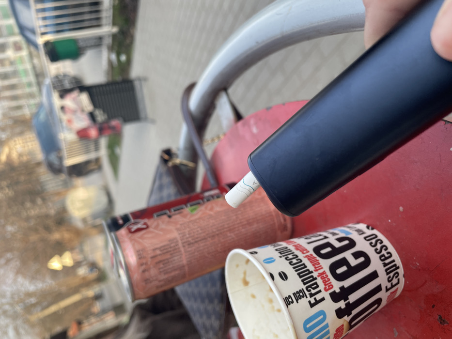 The image depicts an outdoor scene in Pordim, Bulgaria, captured from a first-person perspective looking down at a table and extending into a street view. In the foreground, a hand holds a dark-colored electronic heat-not-burn device with a white tobacco stick inserted, featuring faint blue-green wavy lines near its tip. The device rests on a faded red-painted metal table. Also on the table are a white paper coffee cup, appearing mostly empty with visible brown residue, bearing "Frappuccino," "coffee," and "Espresso" branding along with coffee bean graphics. Next to the cup, a tall, slim, reddish-pink beverage can with obscured labeling (a red 'X' logo is faintly discernible) stands upright. A brown patterned bag, possibly a purse, is partially visible behind these items. A curved, silver-colored metal railing forms part of the table or surrounding outdoor furniture. The background, largely out of focus, reveals a paved outdoor area, likely a sidewalk or plaza, with several leafless trees, indicative of a cooler season. Parked vehicles, including a dark-colored SUV, are visible behind white metal pedestrian barriers. A black A-frame sign and distant buildings are discernible, indicating an urban setting.
