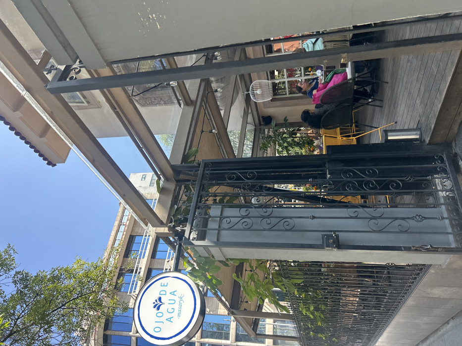 The image depicts an outdoor patio of a restaurant named "Ojo de Agua," as indicated by a circular white and blue sign that also displays "-masaryk