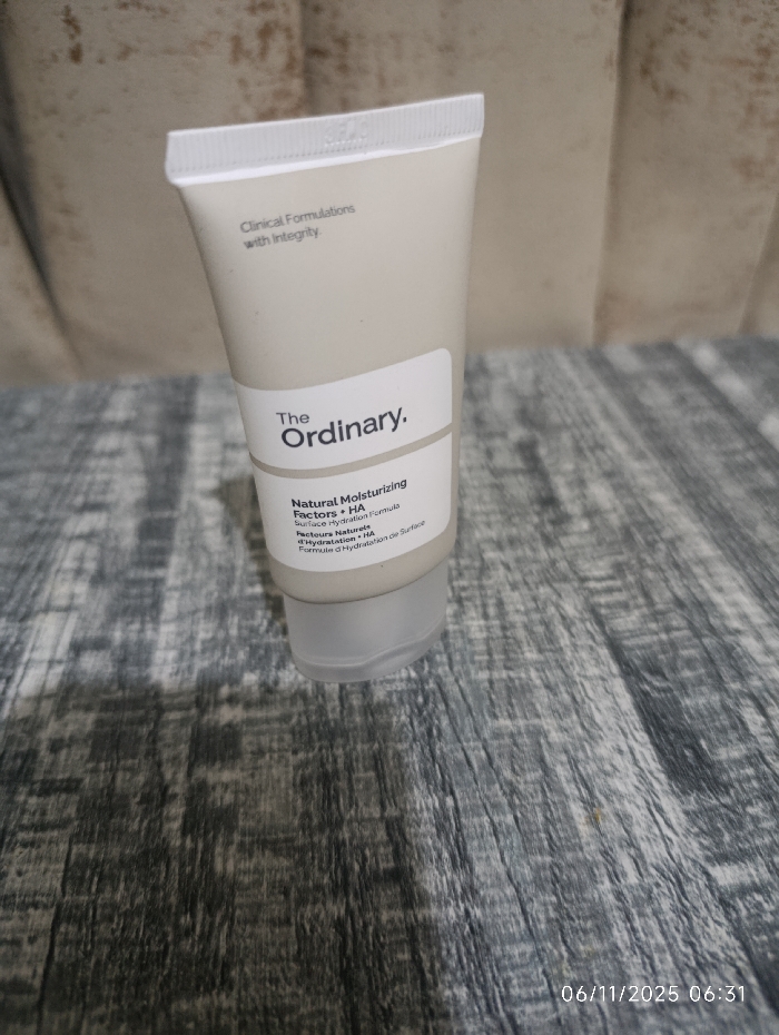 The image features a tube of "The Ordinary. Natural Moisturizing Factors + HA" lotion. The tube is light gray with a white cap and label. The text on the label includes "Clinical Formulations with Integrity," and describes the product as a "Surface Hydration Formula." The background consists of a textured, wooden-like surface and a blurred neutral-colored backdrop. The date "06/11/2025 06:31" is visible in the lower right corner of the image.