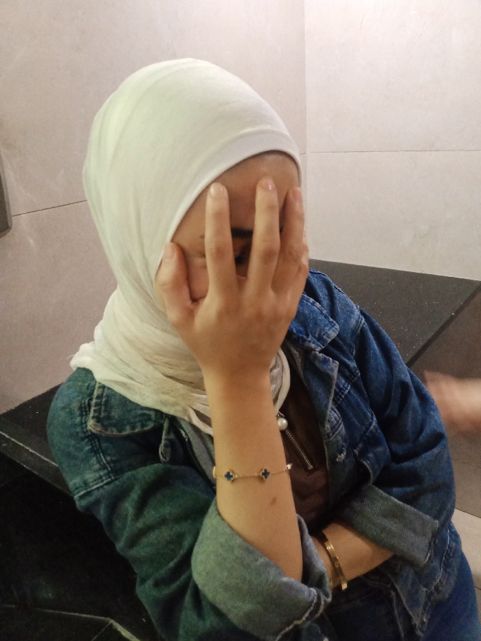 A seated individual, identifiable as female, is depicted indoors within Barza Municipality, Syria. She wears a light-colored, possibly cream, hijab, a blue denim jacket, and a brown undergarment, accessorized with a white pearl pendant necklace. Her right hand, exhibiting light pink fingernail polish and adorned with a gold-colored bracelet featuring four blue clover-shaped charms, covers her face. A simple gold-colored bangle is visible on her left wrist. The immediate environment consists of light-colored, tiled walls and a dark, reflective horizontal surface positioned behind and to the side of the individual. A metallic fixture is partially visible on the upper left tiled wall.