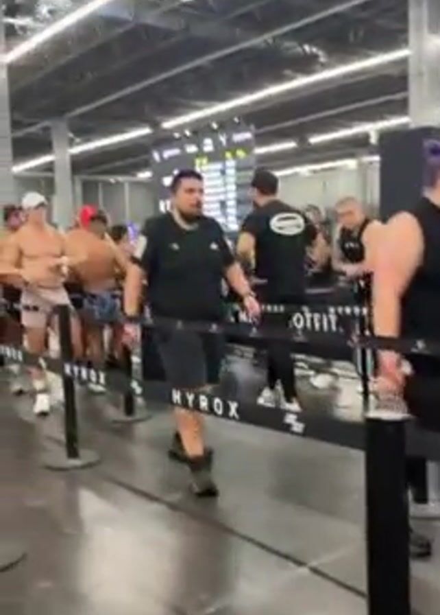 line of people standing behind stanchions. Most of the people are men, with a few women visible, standing in line and chatting, some are shirtless and in athletic shorts and sneakers, some are wearing athletic shirts and shorts and sneakers. The sign on the stanchions reads HYROX. The setting appears to be a fitness convention or competition. The ceiling of the space is high and has a grid pattern. The lighting is bright and even. There is a monitor display to the left and in the background. Some of the people turn to look and respond to the camera.