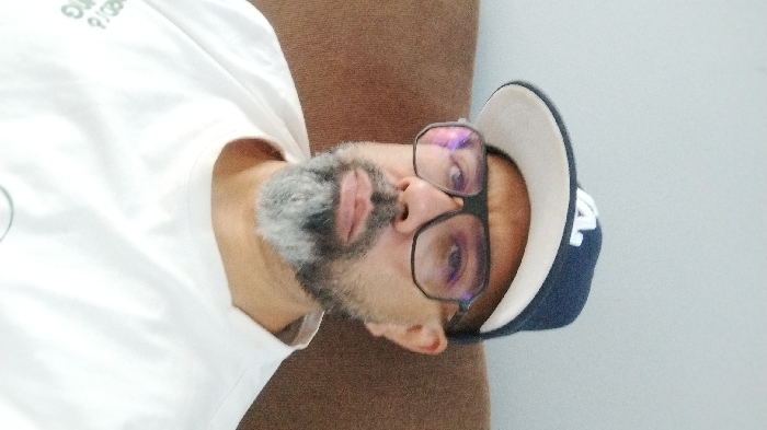 An adult male is depicted in an indoor setting, located in Godoy Cruz, Argentina. The subject possesses an olive skin tone, a neatly trimmed gray beard and mustache, and dark-rimmed, rectangular prescription glasses. He wears a dark blue baseball cap with a white brim, oriented backward on his head, featuring a partial white 'A' logo. The man is dressed in a plain white crew-neck t-shirt, exhibiting faint green text, specifically "2016" and "ING," on the lower left portion. He is seated against a brown, textured fabric surface, presumed to be upholstery, with a light gray wall visible in the background. His expression is neutral, and his gaze is directed towards the camera.