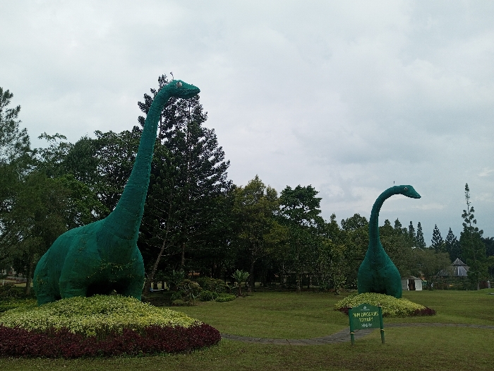 Two large, green dinosaur sculptures, likely made of shrubbery, stand in a grassy park under an overcast sky. The dinosaurs resemble Brachiosaurus or similar long-necked species. Lush trees fill the background, partially obscuring the sky. The foreground includes a sign near the smaller dinosaur. The sculptures are placed on mounds of flowers and greenery, adding to the scene's overall park-like ambiance.