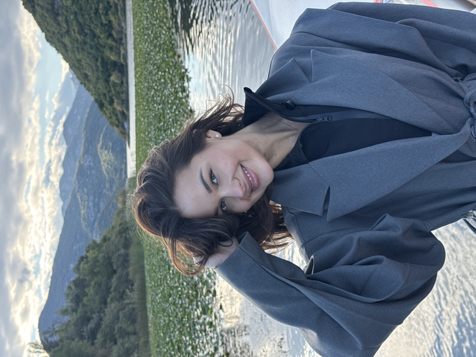 A female subject, appearing to be an adult, is positioned in the foreground, smiling directly at the camera. She has brown hair, fair skin, and is wearing a grey oversized coat cinched at the waist with a tie-belt, over a black quarter-zip top. Small stud earrings are visible in her ears. Her left hand is raised, with fingers partially touching her hair near the back of her head. The subject appears to be on a watercraft or structure, indicated by a white surface in the lower right. The background features a large body of water heavily covered with green lily pads. Beyond the water, vegetated hills and mountains extend under a partly cloudy sky. This scene is located in the vicinity of Vranjina, Montenegro, specifically consistent with the environment of Skadar Lake.