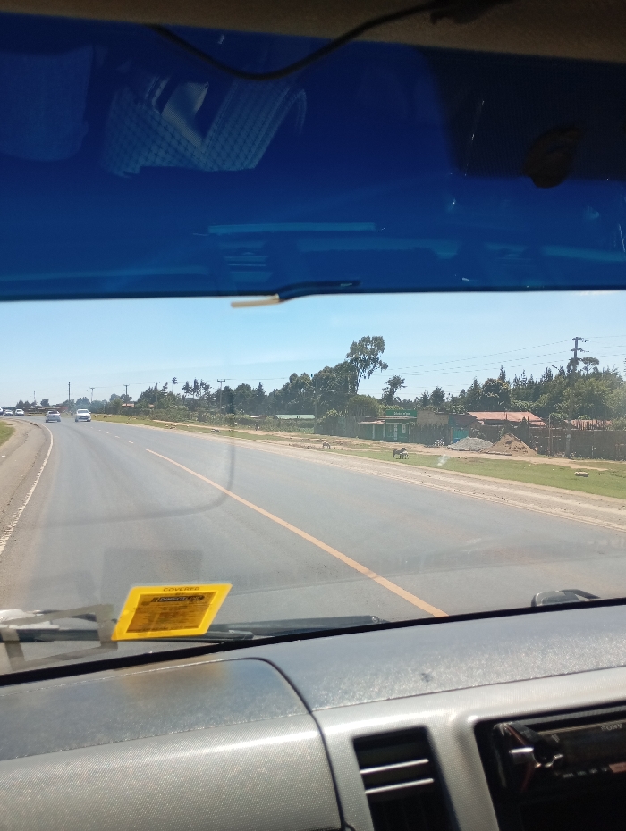 The image depicts a daytime scene from the interior of a vehicle traveling on a multi-lane highway in Flyover, Kenya