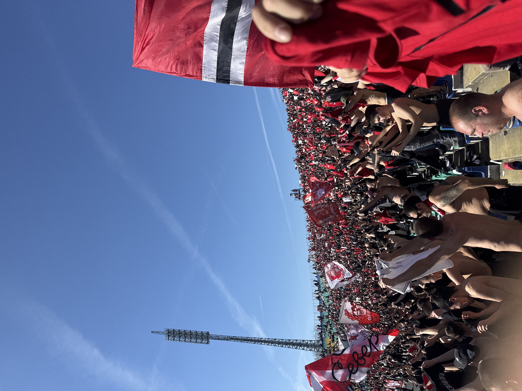 The image depicts a large crowd of people, likely at a sporting event, possibly a football match, in Sofia, Bulgaria. The crowd is predominantly wearing red and white, waving flags and scarves in the same colors. Many people are shirtless. The scene is taken from within the crowd, looking out over the densely packed stands. A large floodlight tower is visible in the background against a clear, blue sky.