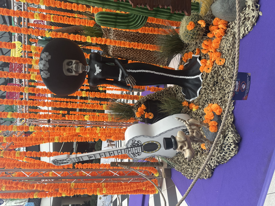 This image displays a static decorative installation with a Día de Muertos theme, situated within an indoor public space, likely a shopping mall, in Les Clayes-sous-Bois, France