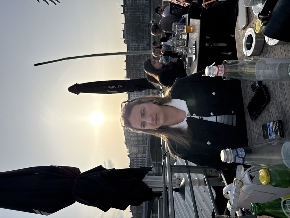 The image depicts an outdoor cafe terrace situated on a riverbank in Lyon, France, during sunset. The low sun is visible and bright, positioned centrally in the upper background, casting a warm glow. In the immediate foreground, a woman with light brown hair and gold hoop earrings is seated, facing slightly to the right with a neutral expression. She wears a black jacket with silver buttons over a white collared shirt and a striped top. Sunglasses are perched on her head. On the wooden table in front of her, from left to right, are: a white handbag with a gold buckle, two green glass bottles (one labeled Perrier, one with a yellow cap), a clear glass water bottle with a blue and white label, a dark smartphone, and a pack of Camel cigarettes with French health warnings. To the woman's right, on the same table, is another clear glass bottle in a metal holder, a silver ashtray, and a black clutch bag. In the midground, behind the primary subject, several other patrons are seated at additional tables. One table shows a glass containing an amber liquid, likely beer, alongside other glassware. All individuals appear to be socializing. The background features the river, with a multi-arched bridge spanning it. Beyond the river, a continuous row of multi-story, light-colored buildings with numerous windows line the opposing bank, characteristic of Lyonnaise architecture. Two large, black, folded outdoor umbrellas are visible on the terrace, one on the far left and another to the right, silhouetted against the bright sky. The sky is a light blue, transitioning to bright yellow and orange around the setting sun. Metal railings separate the cafe terrace from the river below.