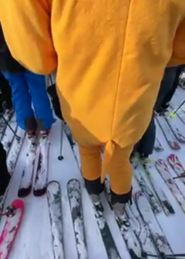 group of people standing on skis in a snowy environment, possibly a ski resort. The person filming is wearing a yellow and white costume, possibly a cartoon character. Other individuals are wearing ski gear, including helmets and jackets. A mountain is visible in the background. The person filming turns the camera to show their face, smiling at the camera. The scene suggests a social gathering or group outing for skiing.