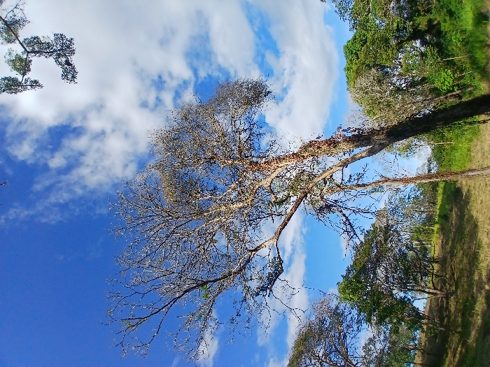 landscape featuring trees, grass, and a blue sky with clouds. A central tree with sparse foliage dominates the scene. The sky is vibrant blue with scattered white clouds. A grassy area with trees lines the right side of the frame. The image appears to be taken from a low angle, looking up towards the sky and trees.