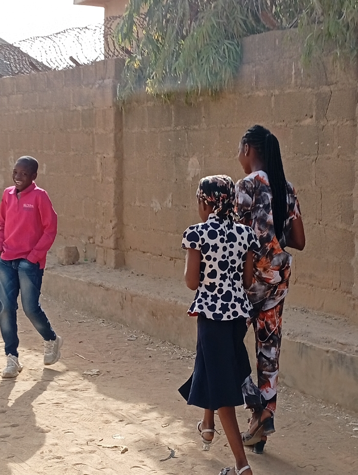 The scene depicts an outdoor setting on a dirt path in Gayawa, Nigeria. A tan concrete block wall, topped with barbed wire and overhung by green foliage, forms the background. The ground is light brown dirt, showing strong shadows indicative of bright daylight. Three individuals are present. On the left, a young male with dark skin and short hair walks towards the right, smiling broadly with an open mouth. He wears a pink long-sleeved polo shirt, blue jeans, and white athletic shoes, with both hands in his pockets. In the center, a young female with dark skin walks away from the viewer. She wears a patterned headscarf, a white short-sleeved top with dark blue heart and flower patterns, a dark blue pleated skirt, and light-colored open-toed sandals. To her right and slightly behind her, another young female with dark skin also walks away from the viewer. She has long dark braided hair and wears a multi-colored patterned t-shirt and matching patterned pants, along with dark wedge sandals. Both females are in motion, walking in the same direction, away from the camera's perspective.
