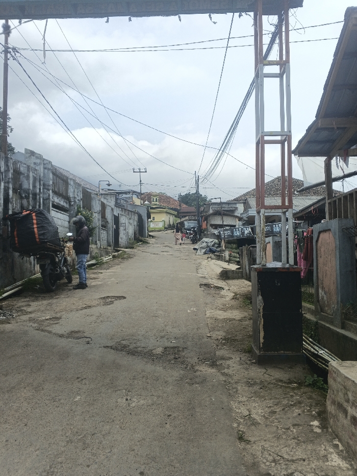 The image depicts a narrow, weathered street in a residential area of Bien Hoa, Vietnam, under an overcast sky. The street surface is composed of worn asphalt or concrete, exhibiting multiple potholes and cracks. In the left foreground, a person stands beside a black motorcycle that is parked facing away from the viewer. The motorcycle carries a large, black, rectangular bundle secured with orange straps on its rear rack. The individual is wearing a dark jacket, light blue jeans, and a dark helmet, and appears to be looking down at an object held in their hands. Behind them, a series of low, grey, concrete walls and fences line the street, indicating the boundaries of properties. Overhead, numerous electrical or communication wires crisscross the sky, emanating from utility poles. In the right foreground, a multi-column, metal structure, painted grey and red-brown, rises from a dark, square base embedded in the ground. This structure appears to be part of an overhead gate frame. To its immediate right, a narrow, concrete drainage ditch runs parallel to the street. Further along the right side, low-rise residential structures with various roof types are visible, some featuring exposed timber frames and corrugated metal roofing. Laundry, consisting of several items of clothing, hangs on a line or rack outside one of these buildings. A partially obscured banner with text, including "RANU" and "EMPIL," is visible near the ground. In the midground, the street ascends slightly and curves gently to the left. Two indistinct figures, one appearing to be an adult and another smaller individual, walk away from the viewer further up the street. A prominent yellow-green building with a red-tiled roof and an arched entrance is visible on the left side of the street in the distance. The background reveals additional residential structures and faint outlines of hills or mountains beneath the cloudy sky.