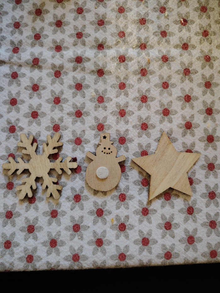 - "An overhead view captures three light-colored wooden Christmas decorations arranged on a white fabric patterned with repeating grey flowers, each featuring a red center" by FM-StHk23, licensed under CC BY 4.0