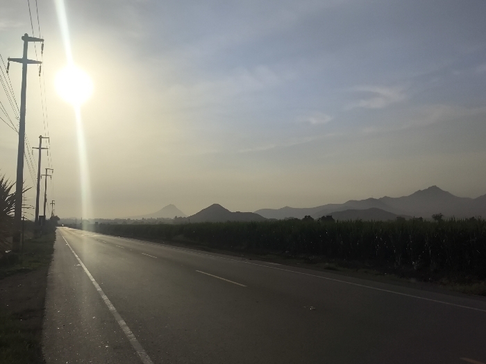 The image captures an outdoor scene in Laredo, Peru, featuring a straight asphalt road, likely a highway or main thoroughfare, stretching into the distance under a hazy sky