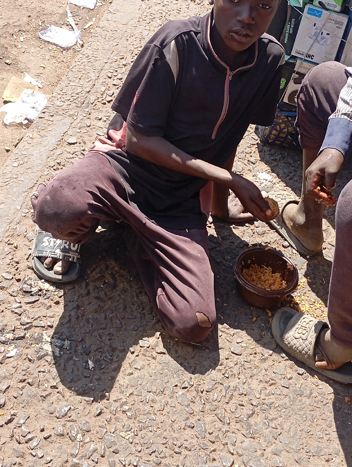 The image captures two individuals seated on a rough, debris-strewn paved surface in Gombe, Nigeria. A young male, likely a child or adolescent, occupies the center-left, directly facing the viewer. He wears a dark short-sleeved shirt with a pink zipper and a light stripe on the upper arm, displaying torn fabric on the left shoulder. His dark trousers are torn at both knees. A dark sandal, labeled "STARUN," is visible on his left foot. His right hand holds a piece of light-colored food. To his right, a second individual's lower body and right hand are partially visible. This person wears dark trousers and a light-colored sandal on their right foot, holding a piece of orange-reddish food. Between the two, a small, dark brown bowl contains a rice dish, with additional food grains scattered on the ground. In the background, behind the primary individual, stacked retail boxes, some marked "POWER BANK" and "HIFI BUDS," are present. The ground features small stones and scattered paper litter. Shadows indicate direct sunlight.