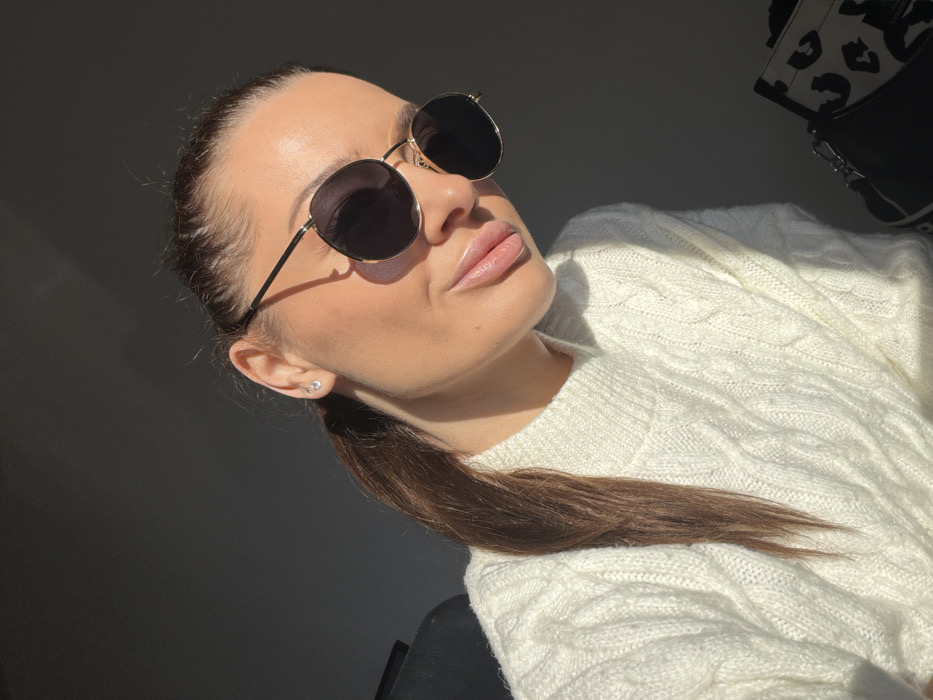 A female individual is depicted in a close-up portrait, located in the city of Varna, Bulgaria. She is seen from the chest up, facing forward with a slight tilt of her head to the left, and a subtle smile. Her dark hair is pulled back into a ponytail, with a portion visible over her right shoulder. She wears round, dark-tinted sunglasses with thin gold-colored frames. A small, clear stud earring is visible in her right earlobe. Her lips are slightly parted, revealing a natural pink hue. She is dressed in a cream or off-white cable-knit sweater. Direct sunlight illuminates the right side of her face and sweater, casting strong shadows on the left side of her face and the background. The background is predominantly a dark gray, out-of-focus plane. On the far left, a portion of a black object, possibly a chair back, is visible. In the lower right corner, a segment of a black and white leopard print item, consistent with a bag, is visible.