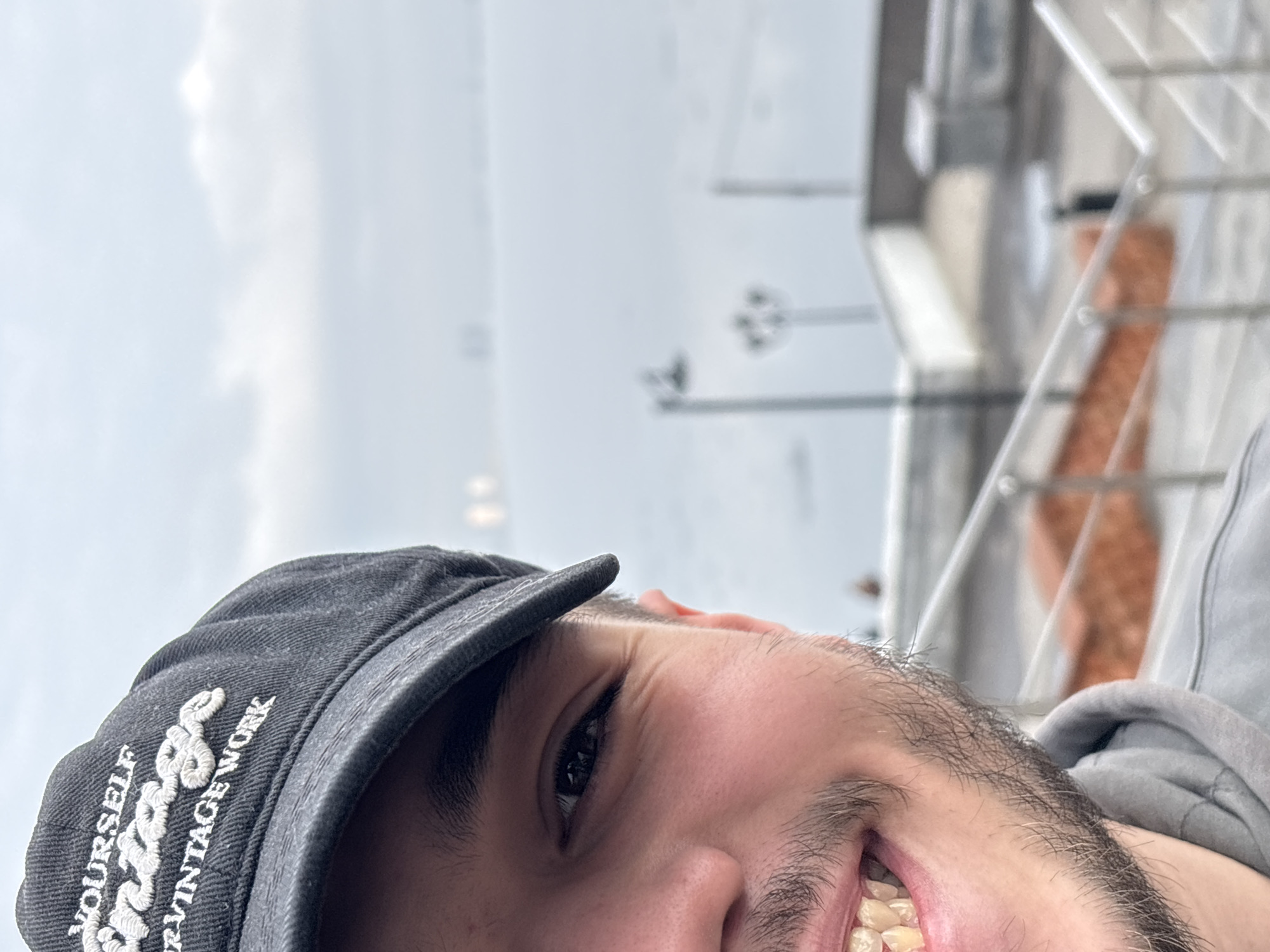 A close-up, tilted selfie shows a smiling person wearing a dark baseball cap with embroidered lettering