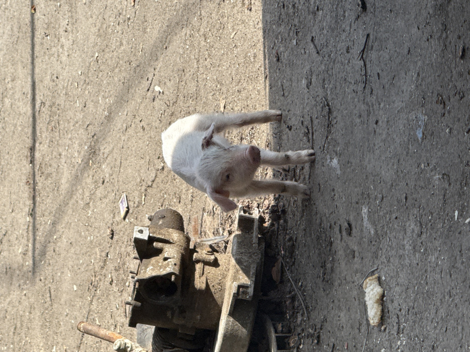 - "In Bakurtsikhe, Georgia, a light-colored piglet stands in the center-right of the frame on a sun-drenched, uneven patch of ground consisting of dirt and cracked asphalt" by FM-XFQ2I2, licensed under CC BY 4.0