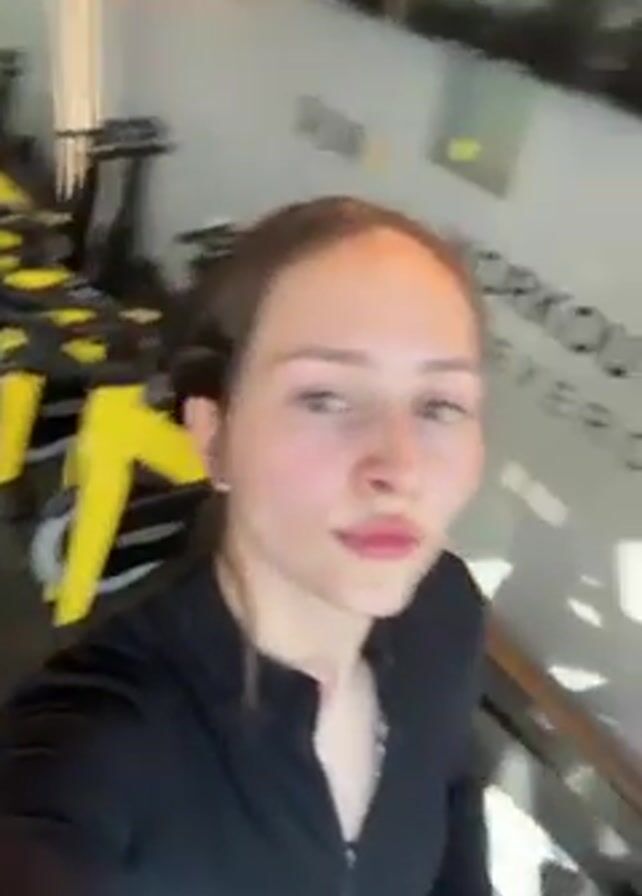 woman in a black zip-up workout top taking a selfie video in what appears to be a gym. Behind her are several exercise bikes, yellow and black in color. A wall behind her has the words "RUN" and "WORKOUT EXERCI". Another woman is visible in the background, wearing a white shirt and tending to her hair. The room has a light, airy feel with a large mirror and natural light coming in. There are also various decorative items on the wall.
