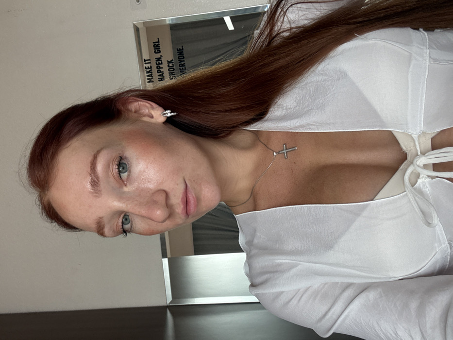 The image displays a close-up portrait of an adult female in an indoor setting, looking directly at the camera. She has long, reddish-brown hair, light skin with visible freckles, and blue eyes. She is wearing a white, semi-sheer top that is tied at the front, revealing a light-colored bra or bralette underneath. She accessorizes with a silver-toned cross pendant on a thin chain around her neck and silver-toned hoop earrings. The background on the left side features a dark, reflective surface, possibly a panel or mirror. On the right side, a mirror reflects an interior space and prominently displays white text, which reads: "MAKE IT HAPPEN, GIRL. SHOCK EVERYONE." The specific location within the city of South Jakarta, Indonesia, cannot be determined from the visual evidence presented in the image.