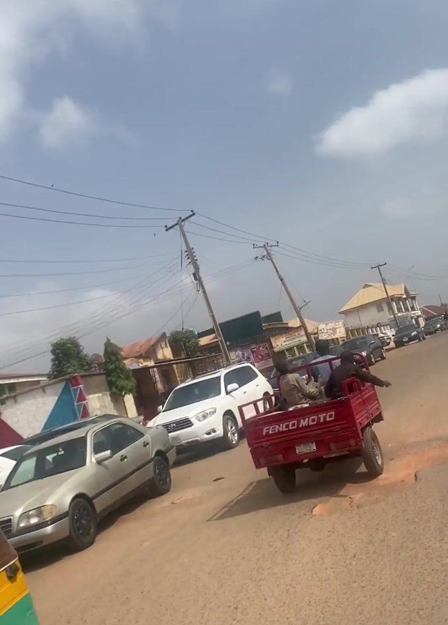 The video depicts a street scene in a bustling urban area. A variety of vehicles, including cars and a motorized tricycle ("keke"), are present. The road is paved but appears somewhat worn. Buildings and utility poles line the street, and the sky is partly cloudy. The general environment suggests a developing country setting.