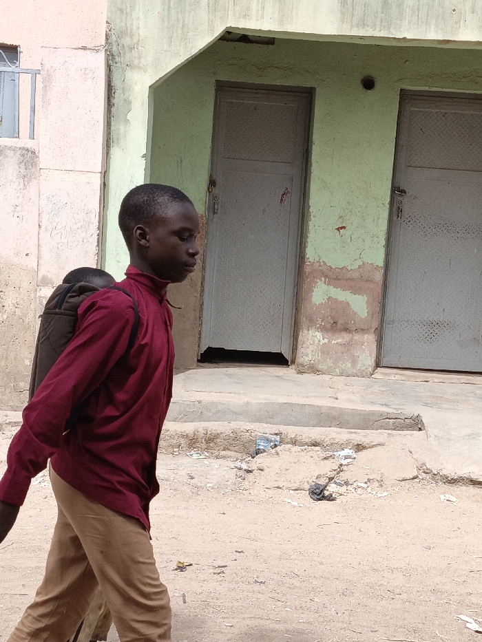 A young male, appearing to be a teenager, walks rightward on an unpaved dirt path in Zango, Nigeria. He has short dark hair and wears a dark red, long-sleeved turtleneck shirt and light brown pants. A dark brown backpack is slung over his shoulders, with the head of a smaller individual, possibly a child, visible above the top of the backpack, being carried on his back. To the left, a light-colored building with a small window is visible. Adjacent to it, a light green building exhibits significant peeling paint, revealing a brown underlayer, particularly at its base. This green building features two grey, corrugated metal doors, both appearing secured, with the left door showing damage at its bottom. Concrete steps and scattered debris, including plastic bottles, are visible on the ground.