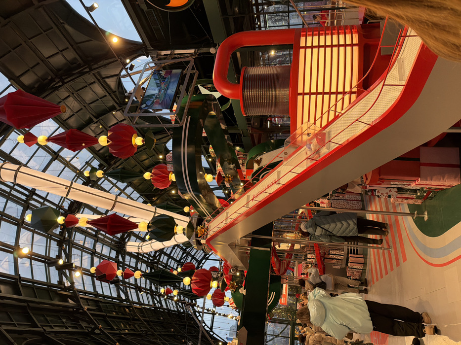 The image depicts the interior of GUM (State Department Store) on Red Square, Moscow, Russia, adorned with holiday decorations. The scene features a high, arched glass roof supported by dark metal framework, from which numerous red and dark green geometric lanterns with yellow internal lights are suspended. White, translucent tubular lighting fixtures also run along the ceiling structure. A large, multi-level festive display dominates the center, characterized by a red and white color scheme with accents of green. A prominent red and white diagonal slide/escalator system ascends from the lower right towards the center, on which a child in a transparent, enclosed capsule is visible, moving upwards. The display incorporates green curvilinear sections, possibly representing conveyor belts, and a large, red, ribbed cylindrical structure with horizontal glowing yellow slats at its base. A screen above the display shows animated content featuring characters in a boat. On the ground floor, several individuals, primarily adults in winter clothing (puffer jackets), are present. A person in a light blue puffer jacket stands in the left foreground, facing away. Another individual in a dark green puffer jacket is seen from behind near the center. The floor features a patterned design of red and white stripes and curved lines in pastel colors. Stacks of wrapped gifts, predominantly red and white, are visible around the base of the festive structure. The overall environment is brightly lit, combining natural light filtering through the glass roof with artificial illumination from the decorations.