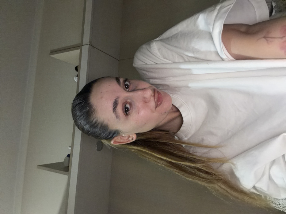 A female subject, appearing to be in her 20s or 30s, is centered in an indoor, artificially lit setting. Her dark brown hair, with lighter highlights, is pulled back into a ponytail that extends over her left shoulder. She looks directly at the camera with a slight smirk. The subject wears a plain, loose-fitting, white crew-neck t-shirt. Her left forearm is visible, exhibiting a linear scar or mark extending from the wrist area upwards, accompanied by diffuse reddish discoloration on the lower forearm. The background consists of a light-colored wall (likely beige or off-white) featuring an overhead shelving unit. This light-colored shelving unit contains several indistinct small objects, including white cylindrical containers and darker items. A circular recessed light fixture is visible on the ceiling above the shelving. The specific location within the city of Sofia, Bulgaria, cannot be determined from the visual information presented.