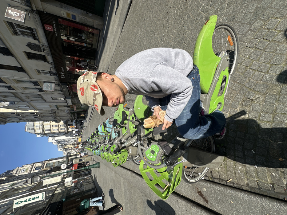The image depicts a sunlit street scene in Paris, France, identified as Rue de l'Abbaye in the Saint-Germain-des-Prés neighborhood of the 6th arrondissement, based on visible signage for "AVANEZ FABRICANT" and "Fondue 9" on the buildings. In the immediate foreground, a male individual, appearing young adult, is seated sideways on the bright green rear fender of a parked Vélib' public rental bicycle. He wears a light grey long-sleeved sweatshirt, blue jeans, and a camouflage-patterned cap featuring red lip motifs. An earring is visible in his left ear. He holds a baguette sandwich, partially wrapped in brown paper, in both hands, with his gaze directed slightly downward and to the right. The front basket of the bicycle he is on contains a clear plastic bottle and other small refuse. To the left of the subject, a long row of identical bright green Vélib' bicycles is parked along the street, extending into the distance. The street itself is paved with cobblestones. Multi-story, traditionally styled Parisian buildings with windows and shutters line both sides of the thoroughfare. Several indistinct pedestrians are visible in the background, walking along the street. Distinct shadows from people and objects are cast on the ground, indicating bright sunlight from a high angle. Scattered cigarette butts are visible on the cobblestone surface near the curb. The sky is clear blue.