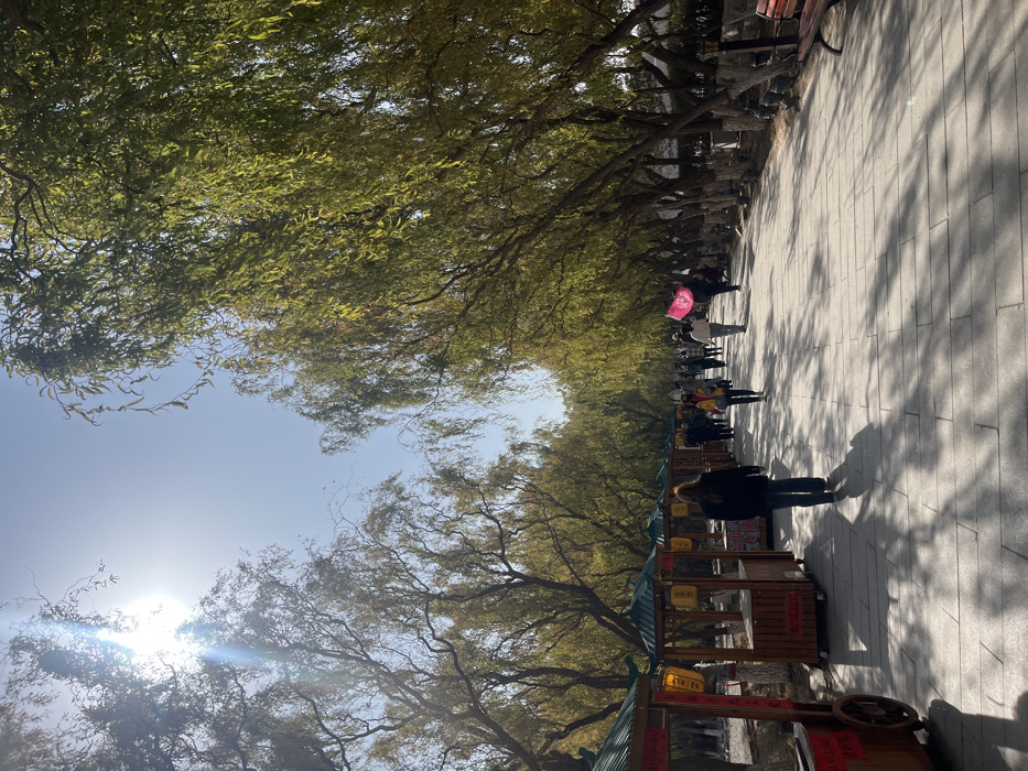 The image displays a sunlit pedestrian pathway within the city of Jiayuguan, China. The pathway is paved with light-colored rectangular flagstones and extends into the background, bordered on both sides by rows of mature trees with weeping, predominantly green and yellowish foliage. Strong sunlight originating from the upper-left quadrant creates significant lens flare and casts sharp, elongated shadows of the trees and individuals across the pavement. Along the left side of the pathway, a series of at least eight unoccupied wooden market stalls, each featuring a dark green pagoda-style roof, are arranged. Several stalls are adorned with red lanterns or signage displaying Chinese characters. A mobile vendor cart with wheels is visible in the immediate foreground on the left. Approximately ten to fifteen individuals are observed walking along the pathway, generally moving away from the camera's perspective. One person in the midground on the right carries a prominent pink banner or flag. A person with long, dark hair wearing a dark jacket and blue jeans walks in the center-left foreground. On the far right, a dark wooden park bench is partially visible beneath the trees, the lower trunks of which are whitewashed.